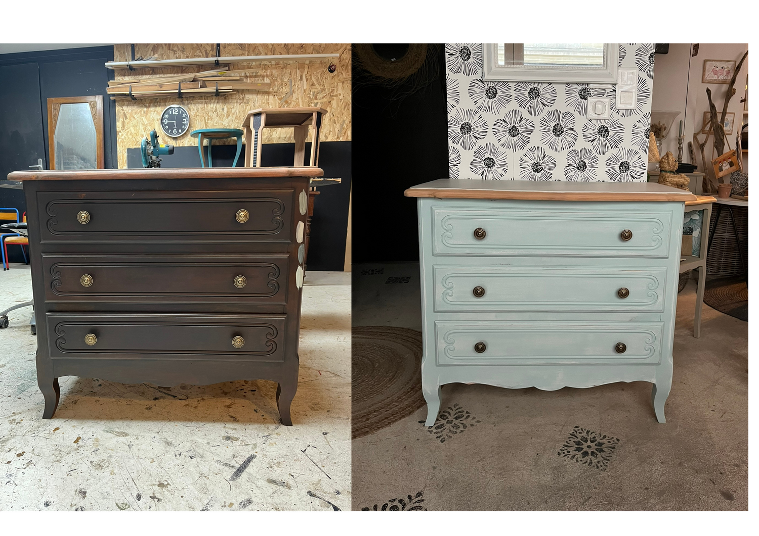 Avant/après travaillé sur commande en bleu céladon style shabby chic