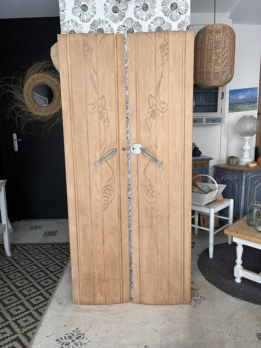 Duo portes d'armoire vintage Art Déco Rose & Marguerite chêne bois massif