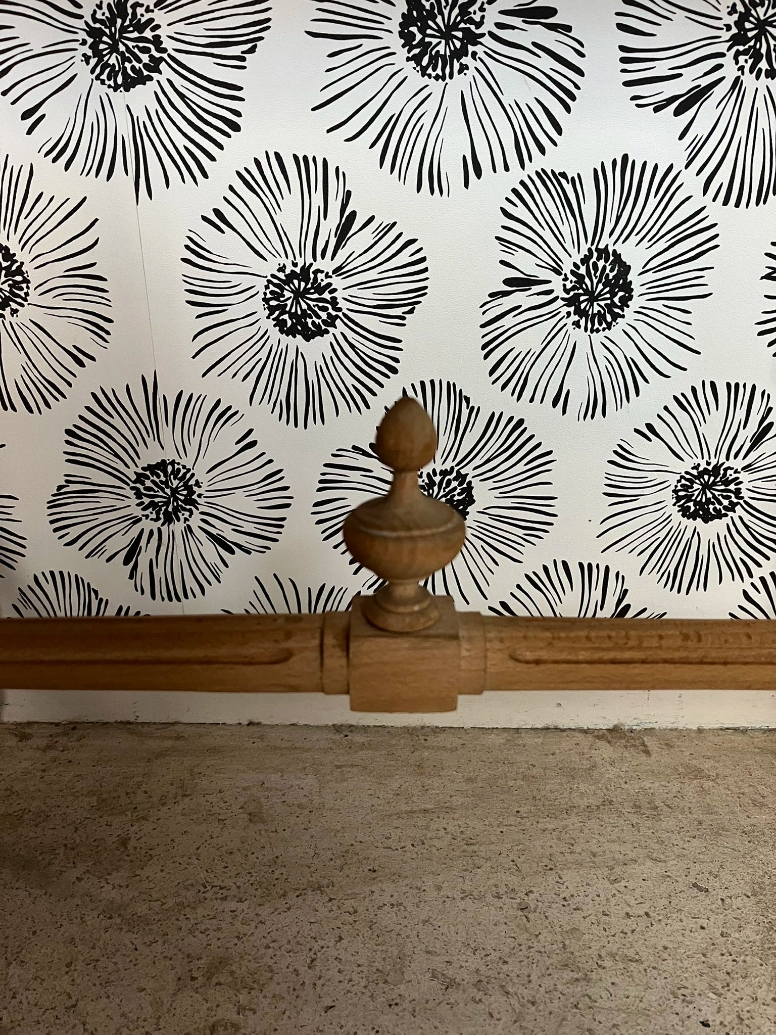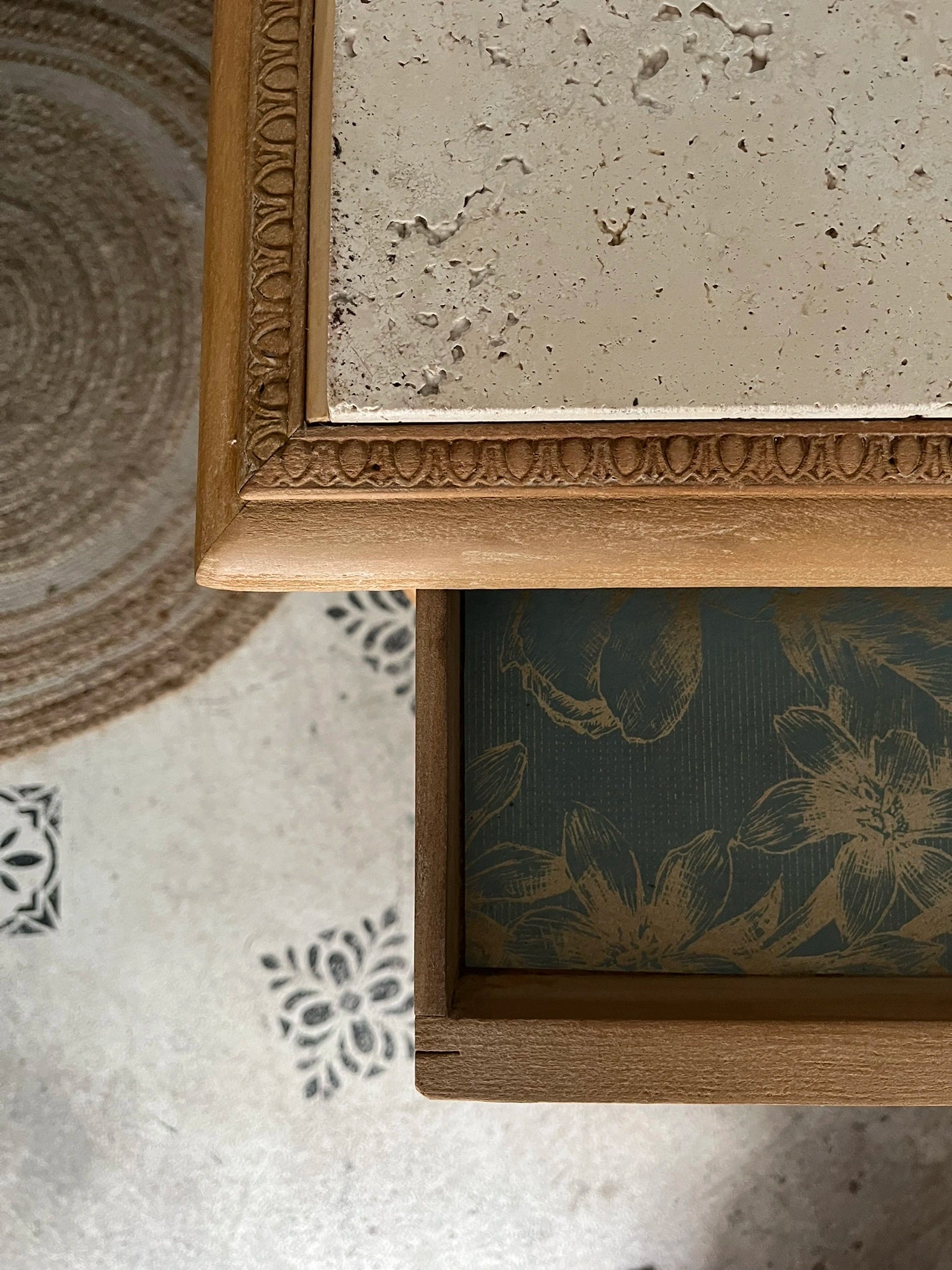 - Son tiroir orné d’un délicat papier peint fleuri sur fond bleu
